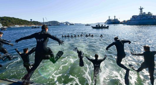 22일 경남 창원 진해군항에서 혹한기 내한훈련에 참가한 해군 특수전전단 해난구조전대(SSU) 대원들이 차가운 겨울바다로 입수하고 있다. /해군 |