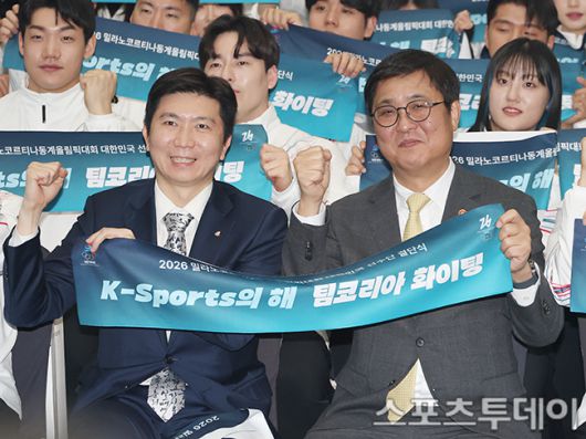 [스포츠투데이 권광일 기자] 유승민 대한체육회장, 최휘영 문체부장관이 22일 오후 서울 송파구 방이동 서울올림픽파크텔에서 열린 2026 밀라노 코르티나 동계올림픽 대한민국 선수단 결단식에 참석해 파이팅 포즈를 취하고 있다. 2026.01.22. [스포츠투데이 권광일 기자 sports@stoo.com]