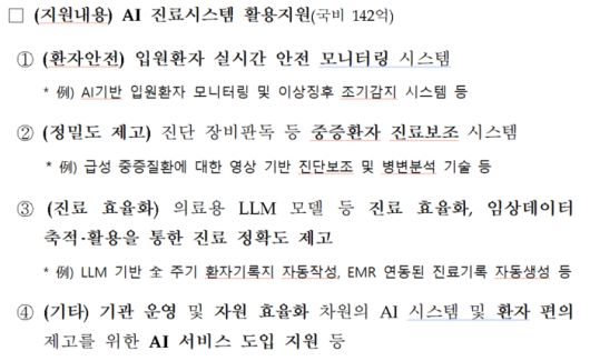 이중규 복지부 공공보건정책관은 “AI 기술은 진료정밀도와 환자 안전을 높이는 중요 수단으로, 국립대병원 등 권역책임의료기관 중심의 지역·필수·공공의료 강화에 큰 도움이 될 것”이라면서 “이번 지원사업을 계기로 공공의료의 AI 기반 혁신을 기대한다”고 밝혔다.
