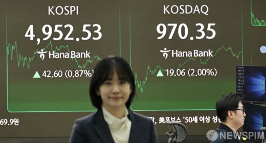 [서울=뉴스핌] 양윤모 기자 = 22일 오후 코스피가 전장 종가보다 42.60 포인트(0.87%) 상승하며 4952.53으로, 코스닥은 19.06 포인트(2.00%) 상승한 970.35로 장을 마감한 가운데, 서울 중구 하나은행본점 딜링룸에서 직원들이 업무를 보고 있다.  서울외환시장에서 달러/원 환율은 전장 대비 1.80원 하락한 1469.50원에 주간거래를 마감했다. 2026.01.22 yym58@newspim.com