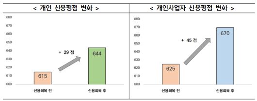 연령대별로 보면 개인 신용회복 효과는 전 연령층에서 고르게 나타났다. 20대 이하 청년층의 신용점수 상승 폭이 평균 37점으로 가장 컸다. 개인사업자의 경우 숙박·음식점업, 도·소매업 등 민생과 밀접한 업종에서 신용 회복 효과가 두드러진 것으로 분석됐다. 전체 평균 신용점수 상승 폭은 개인이 29점, 개인사업자는 45점으로 집계됐다.