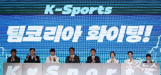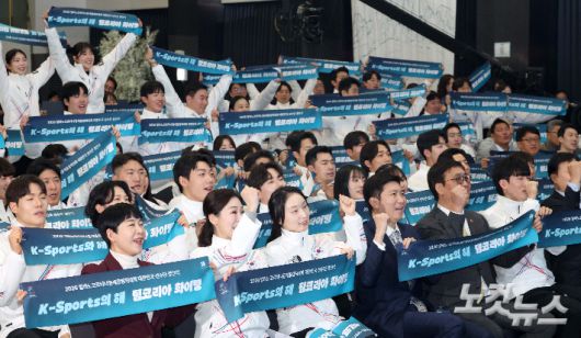 최휘영 문화체육관광부 장관, 유승민 대한체육회장, 이수경 선수단장, 쇼트트랙 최민정, 스피드스케이팅 정재원 등 출전 선수들이 22일 서울 송파구 올림픽파크텔에서 열린 2026 밀라노코르티나 동계올림픽대회 결단식에서 기념촬영을 하고 있다.