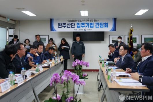 [서울=뉴스핌] 김정관 산업통상부 장관이 22일 전북 완주문화산단 정석케미칼 회의실에서 열린 완주 문화산단 입주기업 간담회에서 참석자들의 의견을 청취하고 있다.이날 간담회에는 정석케미칼, 현대자동차, 한빛테크 등 12개 입기업 및 유관기관 관계자 등이 참석했다.[사진= 산업통상부] 2026.01.22 photo@newspim.com