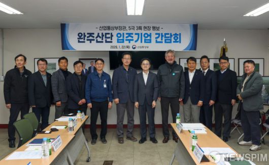 [서울=뉴스핌] 김정관 산업통상부 장관이 22일 전북 완주문화산단 정석케미칼 회의실에서 열린 완주 문화산단 입주기업 간담회에서 참석자들과 기념촬영을 하고 있다.이날 간담회에는 정석케미칼, 현대자동차, 한빛테크 등 12개 입기업 및 유관기관 관계자 등이 참석했다.[사진= 산업통상부] 2026.01.22 photo@newspim.com