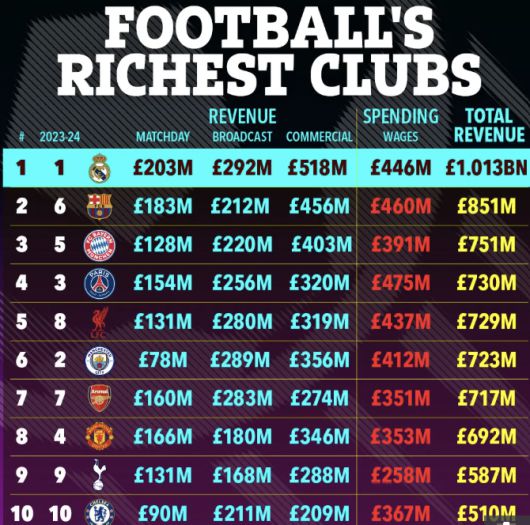 레알 마드리드는 축구단 최초로 매출 10억파운드(약 1조7100억 원)를 돌파하며 1위를 차지했다. 그 뒤를 FC바르셀로나, 김민재의 바이에른 뮌헨, 이강인의 파리생제르맹이 이었다. 손흥민이 지난 시즌까지 뛰었던 토트넘(5억8700만파운드)은 9위를 유지했고, 첼시(5억1000만파운드)가 10위에 올랐다. EPL 다른 클럽 중에선 애스턴빌라가 14위, 뉴캐슬이 17위, 웨스트햄이 20위 순이다. 황희찬의 울버햄튼은 27위에 올랐다.