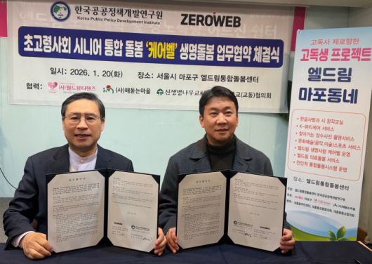 초저출생·초고령사회 생애주기별 돌봄정책을 연구하는 한국공공정책개발연구원(원장 장헌일)과 디지털 라이프 케어 전문 기업 제로웹(대표이사 이재현)은 지난 20일 마포구 엘드림통합돌봄센터에서 ‘K-디지털돌봄’ 체계를 가동하고, 마포구 대흥동을 중심으로 한 ‘케어벨 생명돌봄’ 실증(PoC) 사업 추진을 위한 업무협약(MOU)을 체결했다고 밝혔다.