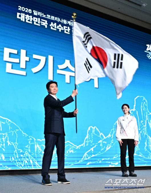 22일 잠실 올림픽파크텔에서 '2026밀라노코르티나 동계올림픽' 출전 대한민국 선수단 결단식이 열렸다. 단기 태극기를 흔들고 있는 대한체육회 유승민 회장. 잠실=송정헌 기자songs@sportschosun.com/2026.01.22/