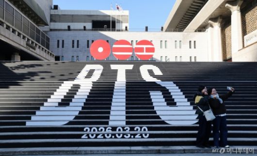 (서울=뉴스1) 임세영 기자 = 6일 오전 서울 종로구 세종문화회관 야외 계단에 설치된 BTS(방탄소년단)의 컴백 로고 조형물 앞에서 관광객들이 기념촬영을 하고 있다. BTS는 3월 20일 컴백과 새 앨범 발매, 월드투어 일정을 공식 발표했다. 2026.1.6/뉴스1 Copyright (C) 뉴스1. All rights reserved. 무단 전재 및 재배포, AI학습 이용 금지. /사진=(서울=뉴스1) 임세영 기자 |
