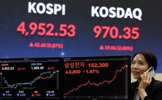 이날 코스피 지수는 전 거래일보다 42.60포인트(0.87%) 오른 4952.53에 거래를 마쳤다. 코스피는 개장 직후 국내 증시 역사상 처음으로 ‘오천피’(코스피 5000)를 달성하고 5019.54포인트까지 치솟았다. 지난해 10월 말 4000선을 넘긴 지 불과 3개월 만이다.