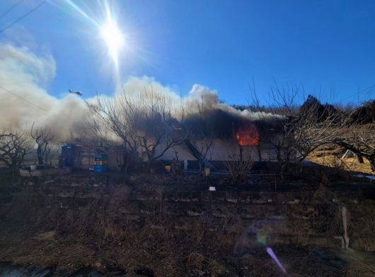 22일 낮 12시22분쯤 경북 영천시 청통면의 한 단독주택에서 화재가 발생해 인근 야산으로 확산된 가운데 진화당국이 발화 50분만에 큰 불길을 잡고 완전진화에 주력하고 있다.[사진=경북소방본부]2026.01.22 nulcheon@newspim.com |