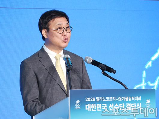 [스포츠투데이 권광일 기자] 최휘영 문체부장관이 22일 오후 서울 송파구 방이동 서울올림픽파크텔에서 열린 2026 밀라노 코르티나 동계올림픽 대한민국 선수단 결단식에 참석해 격려사를 하고 있다. 2026.01.22. [스포츠투데이 권광일 기자 sports@stoo.com]