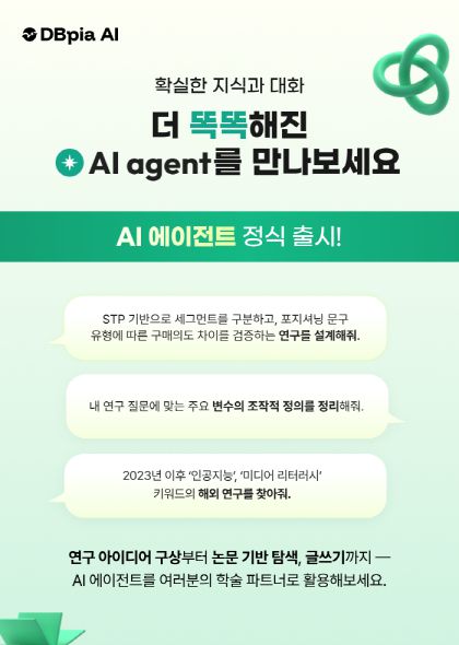 'DBpia AI 에이전트'는 국내외 2억7천만건의 방대한 학술자료를 기반으로 연구자와 대화하며 연구를 돕는 DBpia AI의 신규 기능이다. 기존 'DBpia AI 검색'이 질문에 대해 논문 근거를 바탕으로 한 답변을 제공하는 서비스였다면, 이번에 출시된 AI 에이전트는 한 단계 더 나아가 연구 아이디어 구상부터 자료 탐색, 글쓰기까지 학술 연구 전반을 연구 비서처럼 지원한다는 점에서 기능이 대폭 고도화됐다.