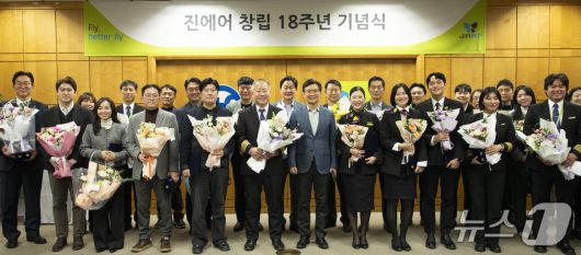22일 열린 진에어 18주년 창립기념식에서 임직원들이 기념 촬영을 하고 있다.(진에어 제공) |
