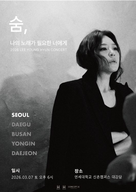 이영현은 오는 3월 7일 오후 서울 연세대학교 신촌캠퍼스 대강당에서 전국 투어 콘서트 '나의 노래가 필요한 너에게 - 숨' 서울 공연을 개최한다. 이번 공연은 서울을 시작으로 대구, 부산, 용인, 대전까지 5개 도시로 이어지는 대규모 투어의 서막이다.
