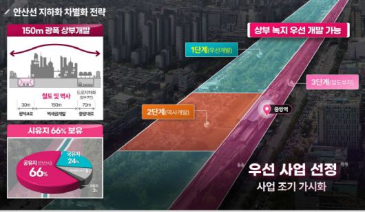 안산선 지하화 통합개발사업은 초지역~고잔역~중앙역을 포함해 지상에 설치된 5.12㎞ 구간의 철로를 주변 지하로 옮기고 기존 철도 부지와 전철역 상부 등을 합쳐 71만2000㎡를 개발하는 것이다.