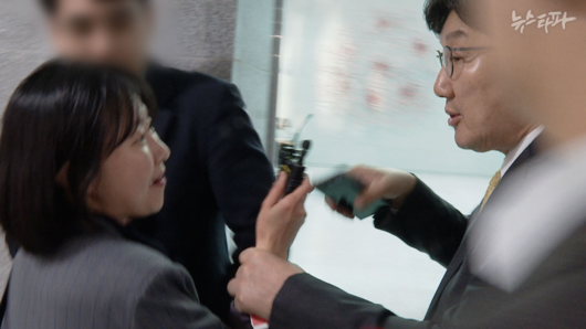 ▲2025년 4월 16일, 권성동 당시 국민의힘 원내대표가 국회 의원회관에서 자신에게 질문하는 뉴스타파 이명주 기자의 손목을 강제로 잡아채 끌고 가고 있다.