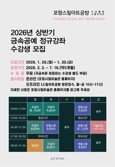 수강신청은 포항시립미술관 홈페이지 또는 스틸아트공방 현장 접수로 진행된다.