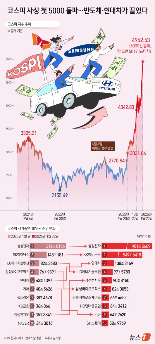 (서울=뉴스1) 김지영 디자이너 = 22일 '오천피'(지수 5000포인트)를 달성한 코스피가 역대 최고 종가로 장을 마쳤다. 한국거래소에 따르면 코스피는 전일 종가와 비교해 42.60포인트(p)(0.87%) 상승한 4952.53로 거래를 마쳤다. 코스피는 장 초반 5019.54까지 터치하며 새 역사를 썼고, 오후 들어 상승 폭을 줄이며 4950선으로 마감했다.