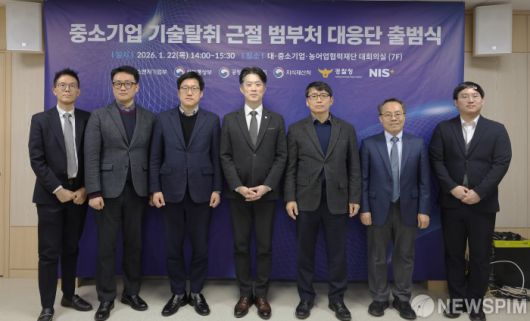 [서울=뉴스핌] 노용석 중소벤처기업부 제1차관이 22일 서울 중구 대·중소협력재단에서 열린 '중소기업 기술탈취 근절 범부처 대응단 출범식'에서 참석자들과 기념 촬영을 하고 있다.[사진= 중소벤처기업부] 2026.01.22 photo@newspim.com