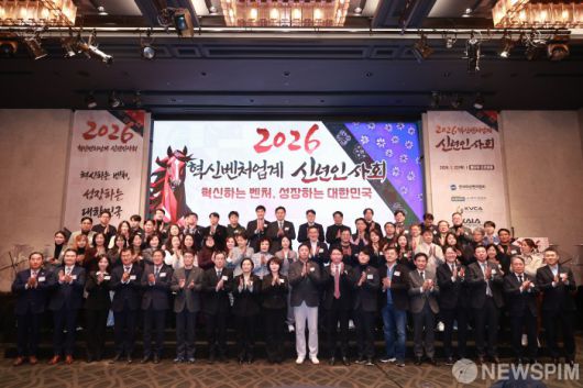 [서울=뉴스핌] 한성숙 중소벤처기업부 장관이 22일 서울 서초구 엘타워에서 열린 2026 혁신벤처업계 신년인사회에서 참석자들과 기념 촬영을 하고 있다.[사진= 중소벤처기업부] 2026.01.22 photo@newspim.com
