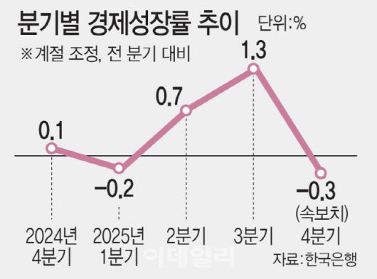 한국은행은 2025년 4분기 실질 국내총생산(GDP)이 전기대비 0.3% 감소(속보치)했다고 22일 밝혔다. 전년동기대비로는 1.5% 증가했다. 경제성장률은 경기의 변화를 빠르게 포착하고자 할 때는 계절적인 요소를 제거한 전기대비 흐름을 주로 본다.