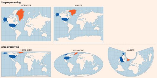 전 세계에서 가장 널리 쓰이는 세계지도는 메르카토르 투영법을 기반으로 한다. 이 방식은 항해와 방향 표시에는 유리하지만, 북극과 남극에 가까울수록 면적을 극단적으로 부풀린다. 그 결과 그린란드는 세계지도에서 아프리카 대륙과 맞먹는 크기로 그려진다.