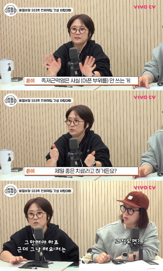송은이는 '갓생'을 사느라 족저막근염까지 걸렸다는 한 구독자의 사연을 읽고 "족저막근염이 많이 걷는 사람들, 뛰는 사람들한테 생기는 거다. 사실 아픈 부위를 안 쓰는 게 제일 좋은 치료다"라고 충고했다.