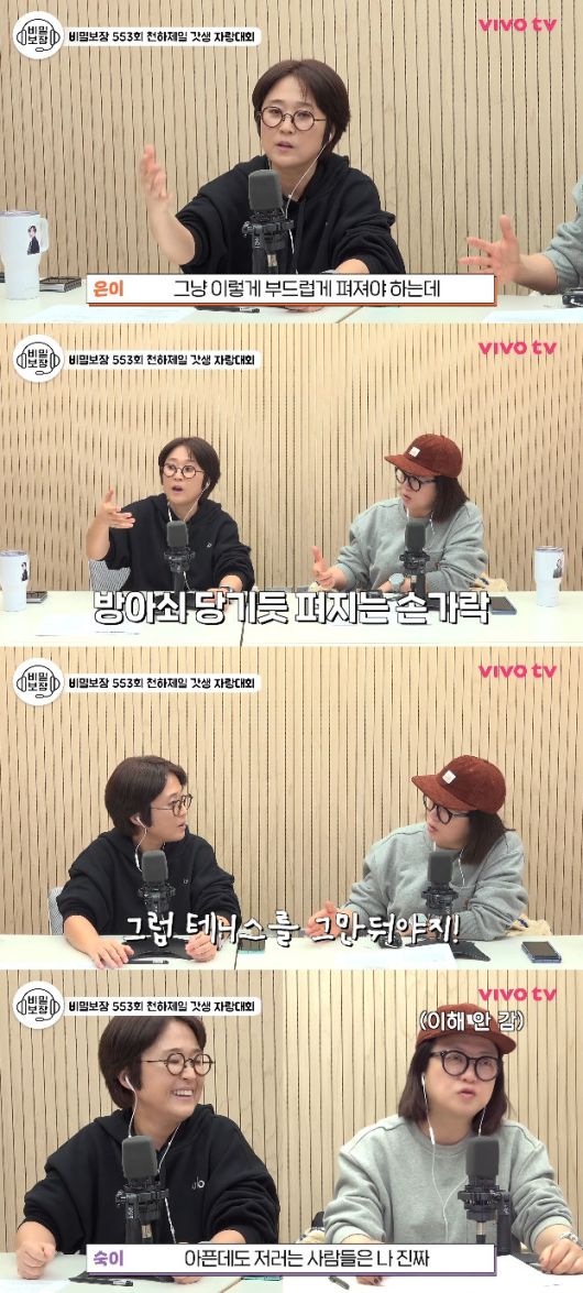 이어 송은이는 "그리고 손가락 아픈 이유도 방아쇠 증후군이 생겼기 때문이다. 테니스를 칠 때 힘을 주고 했더니 손가락이 방아쇠 당기듯 펴진다. 병원 가서 물어보니 '방아쇠 증후군이다'고 하더라"고 밝혔다.