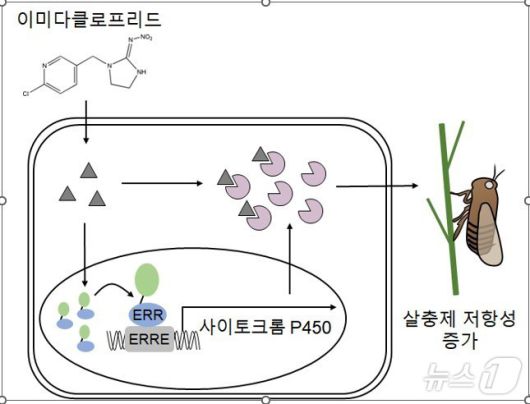 연구 결과, ERR 유전자가 살충제 해독 대사에 관여하는 사이토크롬 P450 효소 유전자(CYP4CE1, CYP6CW1)의 전사 조절 부위에 직접 결합해 이들 효소의 발현을 촉진한다는 사실을 규명했다.