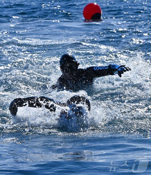 (동해=뉴스1) 윤왕근 기자 = 해군 1함대 해난구조전대(SSU) 5구조작전중대 대원들이 22일 철인 심해잠수팀 선발 경기 릴레이 수영 종목에서 반환점을 돌아 마지막 골라인을 향해 전력을 다하고 있다.(해군1함대 제공, 재판매 및 DB 금지) 2026.1.22/뉴스1