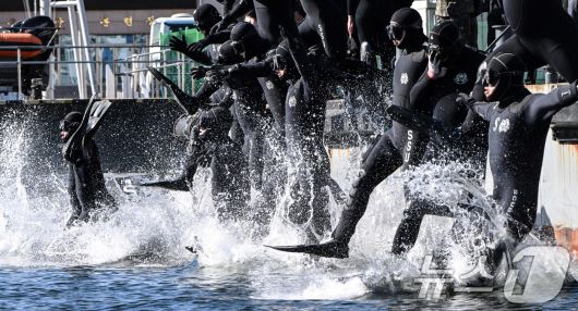 22일 오전 11시 30분 경남 창원시 진해 군항 12부두 앞바다. 해군 특수전전단 소속 해난구조전대(SSU) 대원들이 뛰어든 자리엔 새하얀 물보라가 부글거리며 하늘 높이 치솟았다. 이날 부두 인근 기온은 영하 7도, 수온은 6도를 기록했다.
