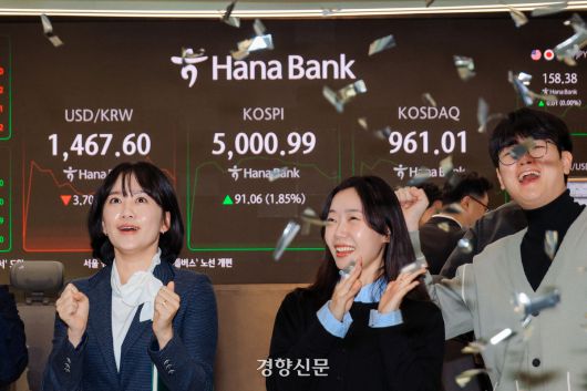 22일 서울 중구 하나은행 본점 딜링룸 현황판에 장 초반 5000 포인트를 돌파한 코스피 지수가 표시되고 있다.이준헌 기자 |