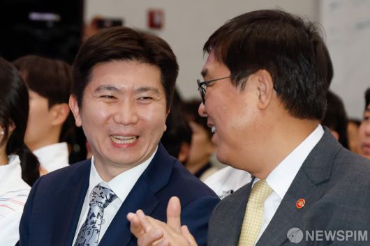 [서울=뉴스핌] 류기찬 기자 = 최휘영 문화체육관광부 장관(오른쪽)과 유승민 대한체육회장이 22일 오후 서울 송파구 올림픽파크텔에서 열린 ‘2026 밀라노 동계올림픽 선수단 결단식’에서 대화를 나누고 있다. 2026.01.22 ryuchan0925@newspim.co |