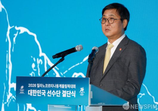 [서울=뉴스핌] 류기찬 기자 = 최휘영 문화체육관광부 장관이 22일 오후 서울 송파구 올림픽파크텔에서 열린 ‘2026 밀라노 동계올림픽 선수단 결단식’에서 격려사를 하고 있다. 2026.01.22 ryuchan0925@newspim.com