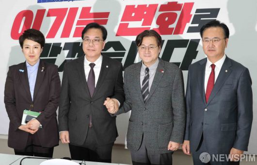 [서울=뉴스핌] 윤창빈 기자 = 홍익표 청와대 정무수석이 22일 서울 여의도 국회에서 송언석 국민의힘 원내대표를 예방해 기념촬영을 하고 있다. 왼쪽부터 김은혜 원내수석부대표, 송 원내대표, 홍 수석, 유상범 원내수석부대표. 2026.01.22 pangbin@newspim.com