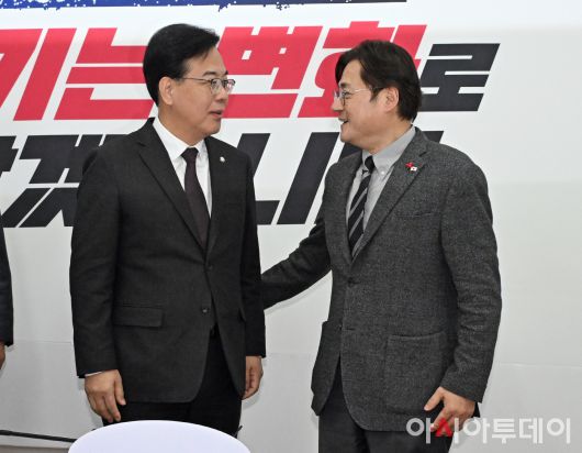 아시아투데이 송의주 기자 = 송언석 국민의힘 원내대표(왼쪽)가 22일 국회에서 홍익표 청와대 정무수석과 만나 인사를 나누고 있다.
