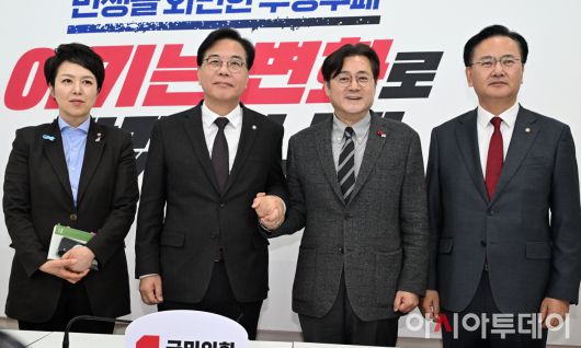 아시아투데이 송의주 기자 = 송언석 국민의힘 원내대표가 22일 국회에서 홍익표 청와대 정무수석과 만나 기념촬영을 하고 있다. 왼쪽부터 김은혜 원내정책수석부대표, 송 원내대표, 홍 정무수석, 유상범 원내운영수석부대표. ⓒ "젊은 파워, 모바일 넘버원 아시아투데이"