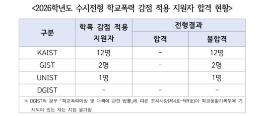 자료에 따르면 2026학년도 수시 전형에서 학교폭력 이력으로 감점을 받은 지원자는 4대 과기원 모두에서 불합격했다. KAIST에서는 학교폭력 감점을 받은 수시 지원자 12명이 전원 탈락했으며, GIST와 UNIST에서도 각각 2명과 1명의 지원자가 같은 사유로 불합격 처리됐다. DGIST의 경우 학교폭력 조치사항 가운데 제4호(사회봉사)부터 제9호(퇴학)에 해당하는 학생은 아예 지원 자격을 제한하고 있어, 이번 전형에서는 학교폭력 이력으로 감점받은 지원자가 없었던 것으로 확인됐다.