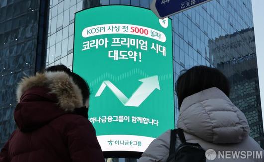 [서울=뉴스핌] 양윤모 기자 = 22일 코스피가 장중 사상 첫 5000선을 돌파하자 서울 중구 하나은행본점의 전광판에 '코리아 프리미엄 시대 대도약!'을 알리는 하나금융그룹의 축하 문구가 송출되고 있다. 한편 이재명 대통령은 더불어민주당 '코스피 5,000 특별위원회' 소속 위원들을 청와대로 초청해 오찬을 함께했다. 2026.01.22 yym58@newspim.com
