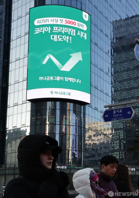 [서울=뉴스핌] 양윤모 기자 = 22일 코스피가 장중 사상 첫 5000선을 돌파하자 서울 중구 하나은행본점의 전광판에 '코리아 프리미엄 시대 대도약!'을 알리는 하나금융그룹의 축하 문구가 송출되고 있다.  한편 이재명 대통령은 더불어민주당 '코스피 5,000 특별위원회' 소속 위원들을 청와대로 초청해 오찬을 함께했다. 2026.01.22 yym58@newspim.com
