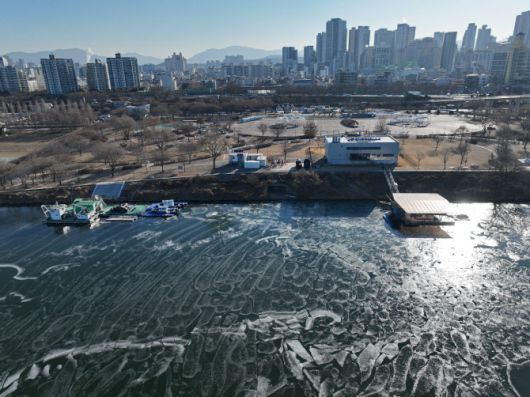 한파가 이어지는 21일 서울 한강 광나루 관공선 선착장 인근 강물이 얼어 있다. (사진=연합뉴스) |