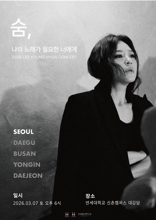 이영현은 오는 3월 7일 오후 서울 연세대학교 신촌캠퍼스 대강당에서 전국 투어 콘서트 ‘나의 노래가 필요한 너에게 - 숨’ 서울 공연을 개최한다. 이번 공연은 서울을 시작으로 대구, 부산, 용인, 대전까지 5개 도시로 이어지는 대규모 투어의 서막이다.