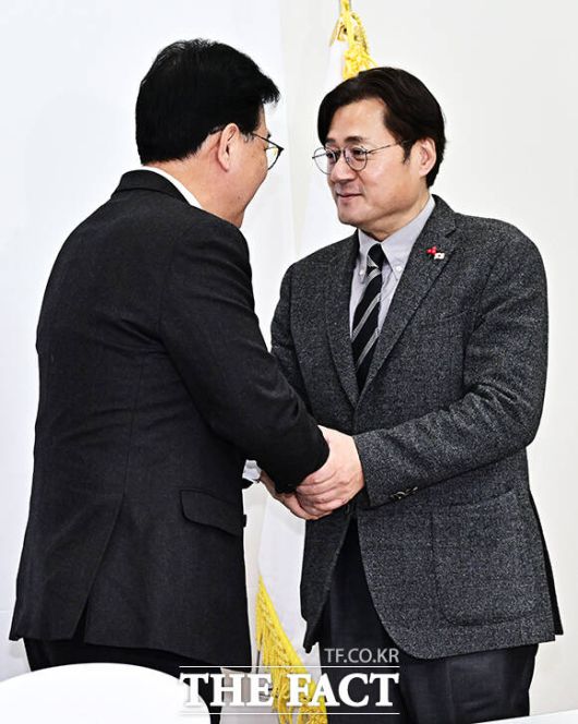 [더팩트ㅣ국회=배정한 기자] 송언석 국민의힘 원내대표가 22일 오후 서울 여의도 국회에서 홍익표 청와대 정무수석을 접견하며 기념사진 촬영을 하고 있다. 왼쪽부터 김은혜 국민의힘 원내정책수석부대표, 송 원내대표, 홍 정무수석, 유상범 국민의힘 원내운영수석부대표.