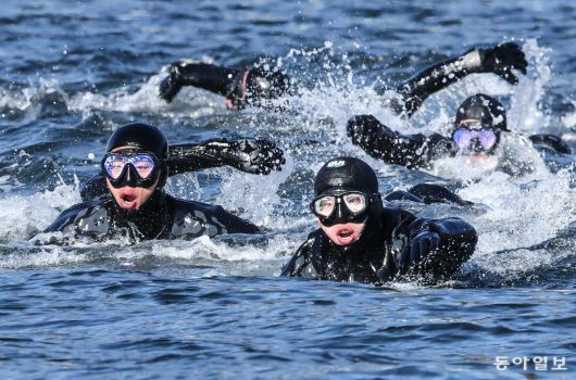 해군 특수전전단 해난구조전대(SSU) 심해잠수사들이 22일 경남 창원시 진해구 진해 군항에서 열린 혹한기 내한 훈련 중 오리발 수영을 하고 있다. 창원=양회성 기자 yohan@donga.com |