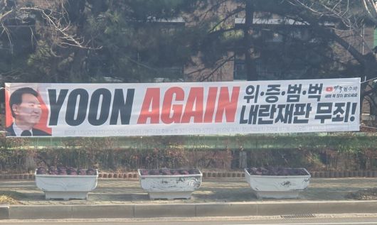 동구청이 철거를 요청한 펼침막에는 윤 전 대통령의 사진과 영어로 쓴 ‘윤 어게인’, ‘위증범벅 내란재판 무죄’라는 문구가 적혀 있다.
