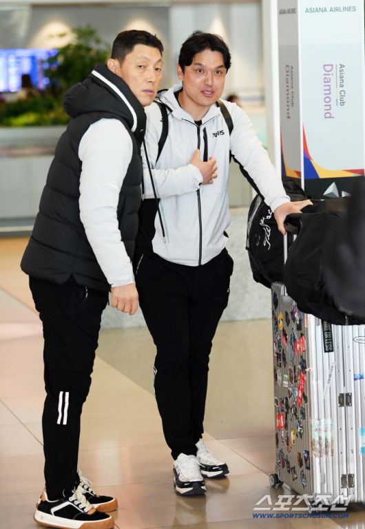 LG 트윈스 선수단이 22일 인천국제공항을 통해 스프링캠프가 열리는 미국 애리조나로 출국했다. 김정준 수석코치와 박동원이 출국장으로 향하고 있다. 인천공항=박재만 기자 pjm@sportschosun.com/2026.01.22/