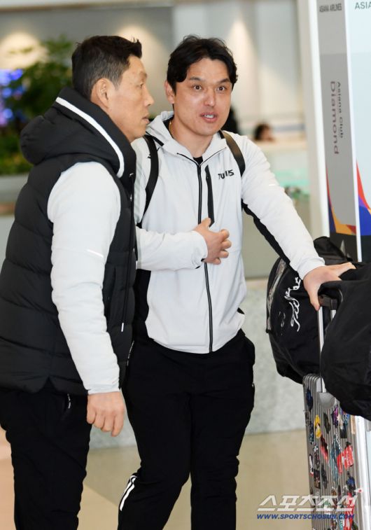 LG 트윈스 선수단이 22일 인천국제공항을 통해 스프링캠프가 열리는 미국 애리조나로 출국했다. 김정준 수석코치와 박동원이 출국장으로 향하고 있다. 인천공항=박재만 기자 pjm@sportschosun.com/2026.01.22/