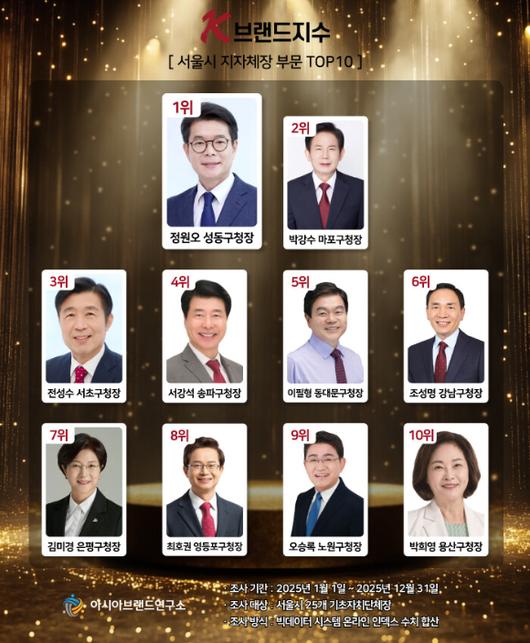 이번 평가는 빅데이터 평가 기관인 아시아브랜드연구소가 실시한 ‘K-브랜드지수 2025년 서울시 지자체장 부문’으로 2025년 1월 1일부터 12월 31일까지 1년간 온라인상에서 수집된 데이터 7338만 9522건을 분석해 산출됐다. 조사 대상은 서울시 25개 기초자치단체장 전원이다.
