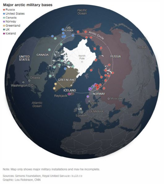 주요 북극 군사 기지 현황 (자료: 시몬스재단, 영국왕립국제문제연구소(RUSI), 그래픽=CNN) |
