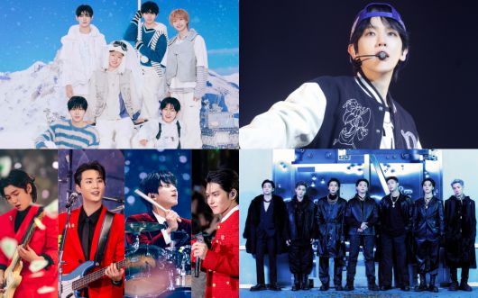 그룹 킥플립(왼쪽 위부터 시계 방향으로), 백현, 방탄소년단, 데이식스. (사진제공=JYP엔터테인먼트, INB100, 빅히트 뮤직) |